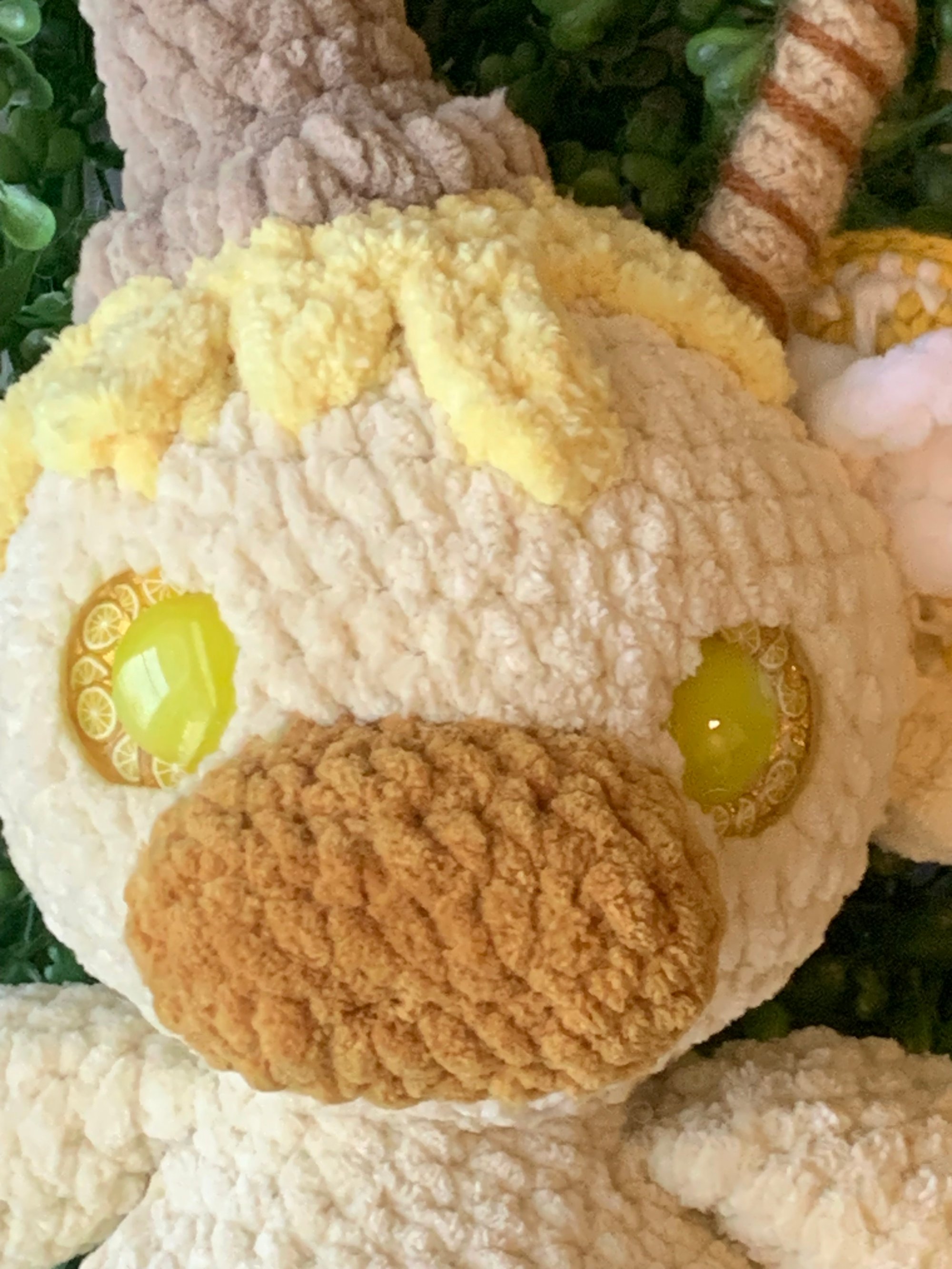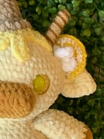 Cow plushie inspired by lemon meringue ice cream! Features a “sliced lemon” and “pirouette cookie” with “whipped cream”. The eyes even feature lemon slices!